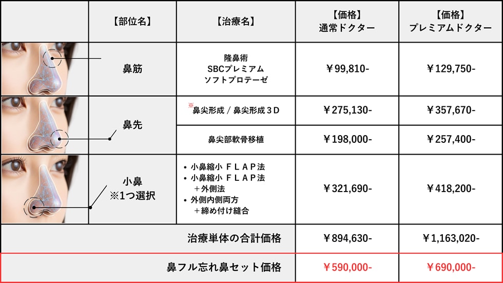 こうした背景には、SNSの普及により「リアルな美意識」が重視されるようになったことや、マスク生活緩和により顔全体の印象への関心が高まったことなどが挙げられます。このような市場のニーズを受け、湘南美容クリニックの「鼻フル忘れ鼻セット」は、経験豊富なドクターによる単一パーツの整形ではなく、顔全体のバランスを考慮した総合的なデザインを重視することで、「自然な仕上がり」を追求するお客さまの期待に応えます。より繊細なこだわりと高い完成度を希望される場合は、当院でより多くの症例数を重ね高い技術を提供するプレミアムドクターによるプランをご用意しております。