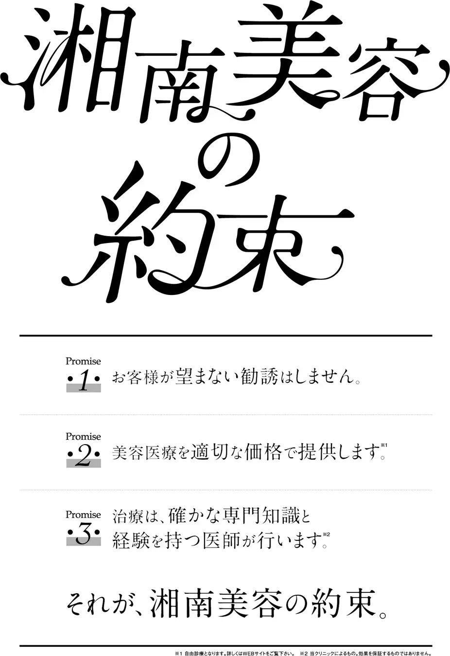 これまで多くのお客さまの美と健康をサポートしてきた私たちは、節目の年を機に、より一層の安心と信頼をお届けするための指針として「湘南美容の約束」を改めて掲げます。私たちはこれからも、美容医療への不安を取り除き、透明性と信頼性をもって、お客さまに安心と前向きな変化を提供することをお約束します。
