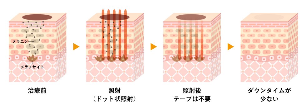 幅広いシミに適応しており、ADMの改善も見込めることが特徴です。また、他のIPLやトーニング等の治療後に残ったシミに対しても効果が期待できます。