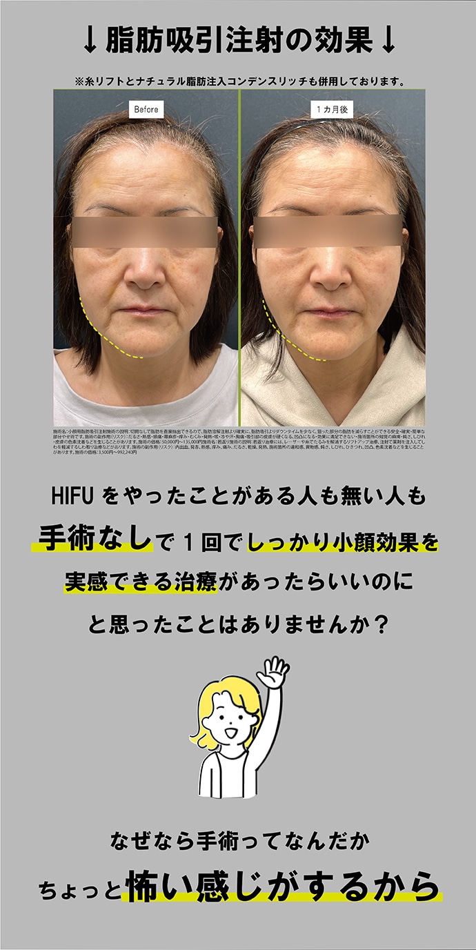 「小顔治療に興味はあるけど、脂肪吸引などの手術は怖い」「HIFUは手軽だけど効果が物足りない」そんな風に感じている方、脂肪吸引注射という治療があることをご存じですか?手軽さも効果も叶えるいいとこ取りな小顔治療なんです♪