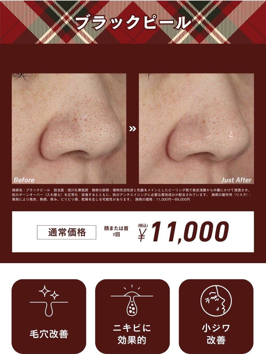 植物性活性炭と乳酸をメインとしたピーリング剤を使用して治療を行います。