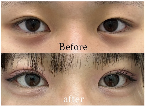まぶたの余剰皮膚を除去して引き上げ、眉毛に沿って縫合することで傷痕はほとんど残りません。二重術なしでも若返り効果や