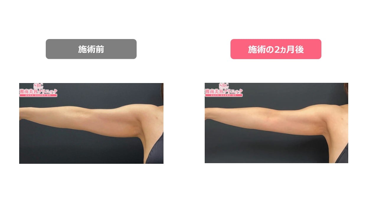 1回目の施術から2ヵ月経った写真では、二の腕から肘にかけてのキュッと細くなる美しいラインが出てきました。また、2回目の施術から3ヵ月経った写真では、垂れ下がっていた二の腕のふりそでがすっきりとし、全体的にボリュームダウンしたことがわかります。