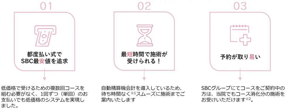 品質・通いやすさにこだわり、湘南美容クリニックの皮膚科治療を中心に厳選したメニューを衝撃価格で提供いたします。1回ずつのご契約を、湘南美容クリニックのコース料金1回分の価格でお得にお受け頂けます。コースの制約に関係なく、必要に応じて次回のご予約をお取りいただけます。