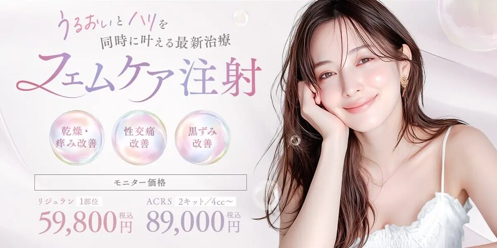 フェムケア注射は、リジュランやACRSといった肌を育成する製剤を、大陰唇・鼠径部・膣入口に注入することで、皮膚や粘膜の保水性・弾力性をサポートし、デリケートゾーンの再生・質感改善を目指す治療です。