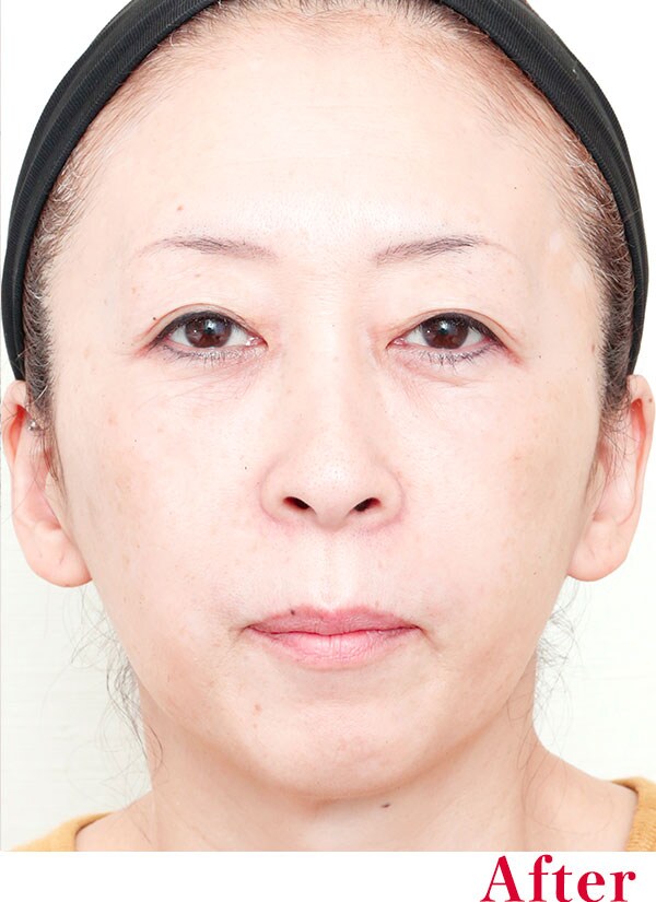 特に目の下のふくらみが気になっていらっしゃいましたが、ここは眼窩脂肪(がんかしぼう)が突出することで出っ張り、さらにその下に段差が出来る事で凹みの原因となっていました。これは中顔面あたりのボリュームが減ってくることも原因の一つで、中顔面全体をふっくらとさせることが必要になります。ですので、今回は顔全体のたるみと合わせて改善していくことがポイントです。
