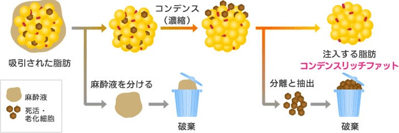 コンデンスリッチ豊胸は、採取した脂肪から不純物・水分の除去に加え、コンデンス(濃縮)技術で、老化で肥大化した脂肪細胞を除去し、定着に有利な脂肪を仕分けることが可能です。