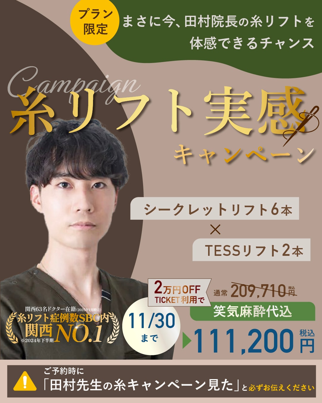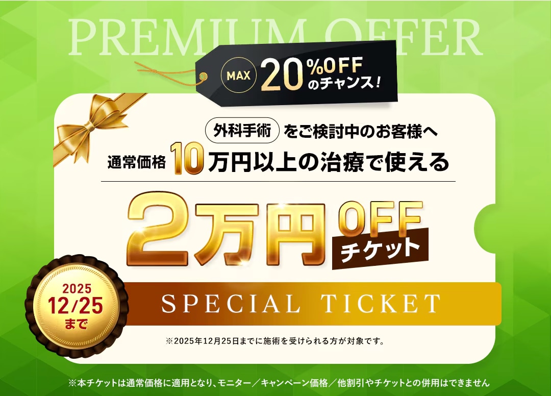 | 2 | このチケットはお会計時の麻酔代を除く美容外科治療の会計が10万円を超えた場合に2万円割引が適用されます。 |