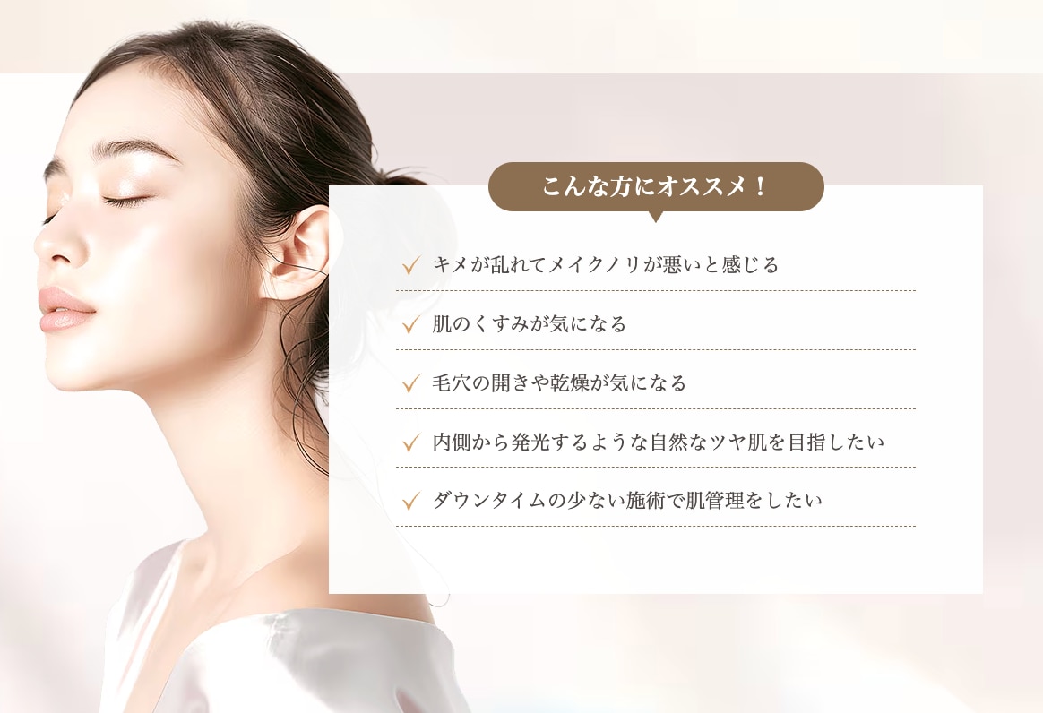 医療機関だからこそ扱える高濃度の薬剤を使用するため、自宅でのケアでは解決できなかった、根深いくすみや乾燥による小じわに対して、ダイレクトに働きかけることが可能です