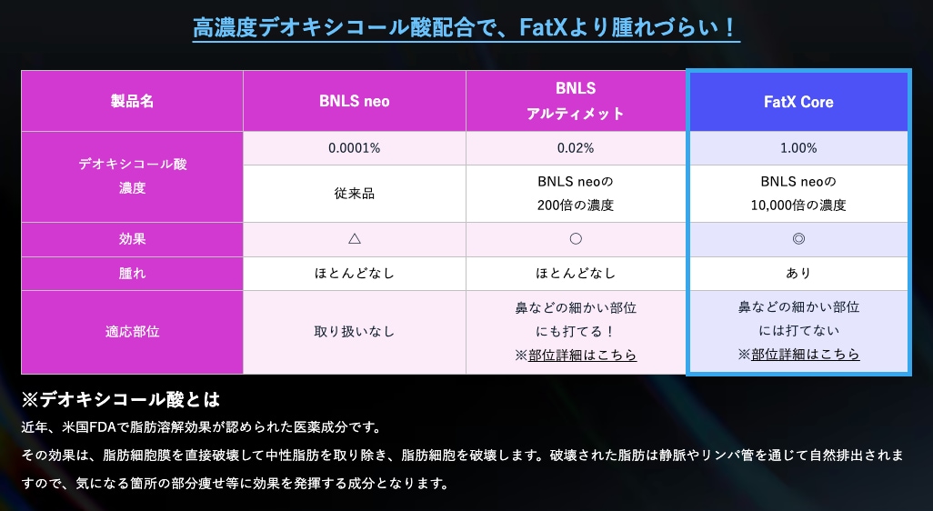米FDAに脂肪溶解の効果が認められたデオキシコール酸を従来の脂肪溶解注射(BNLS neo)の10,000倍配合している最新の脂肪溶解注射です