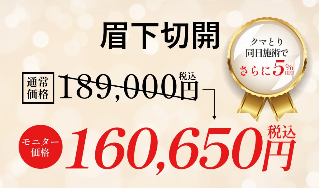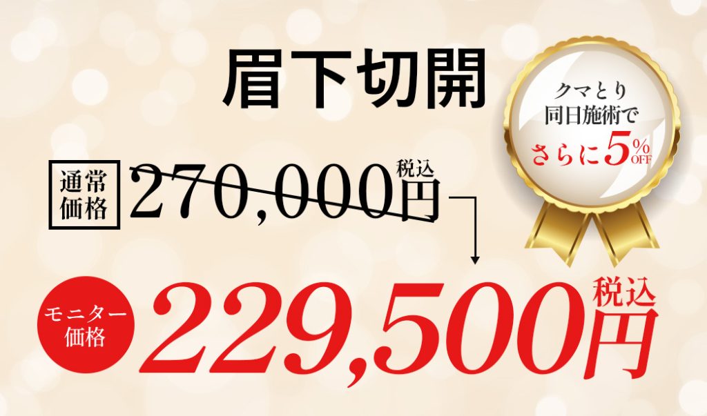 今なら眉下切開が20%OFFで受けていただけるお得なキャンペーン🉐さらに今20%OFFキャンペーン中のクマとりと併用でさらに追加で5%OFF✨こんなにお安くなるのは今だけです!お気軽にカウンセリングにお越しください♡