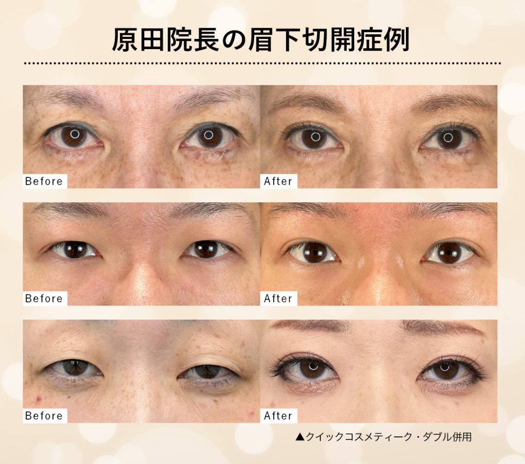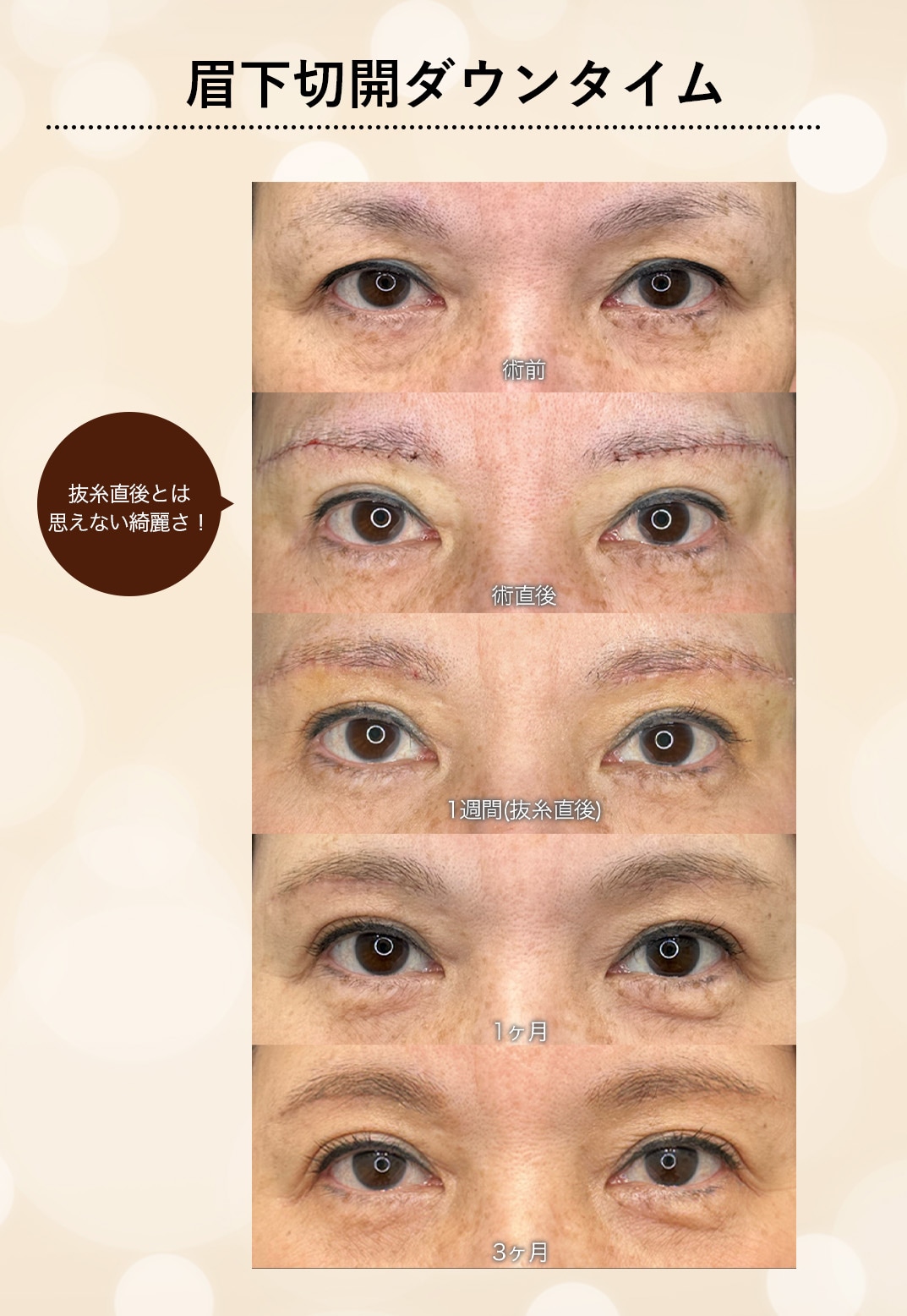 眉の境界線に合わせて縫合するため、傷跡がほとんど目立たないのも特徴。二重術なしで、お顔全体の印象を明るく、若々しい印象へ導きます✨
