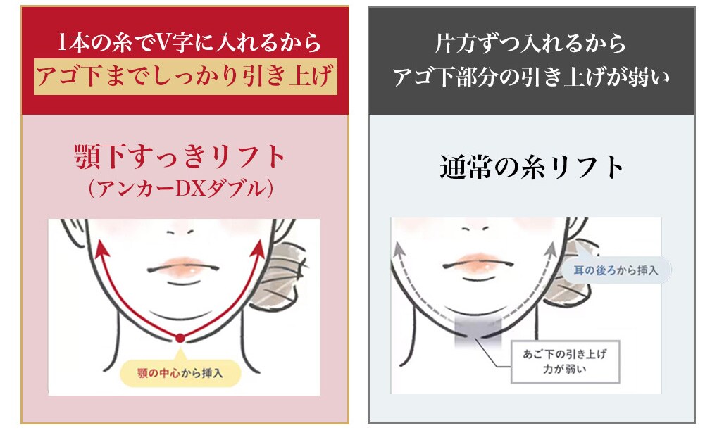 一本の糸で、フェイスラインの端から端までを網羅的に引き上げることで高い引き上げ力を実現できます!