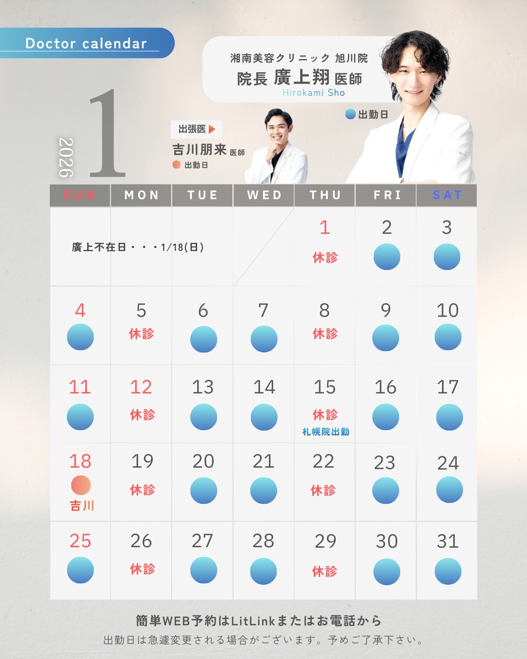 【湘南美容クリニック 旭川院】2026年1月営業日カレンダー更新🗓️