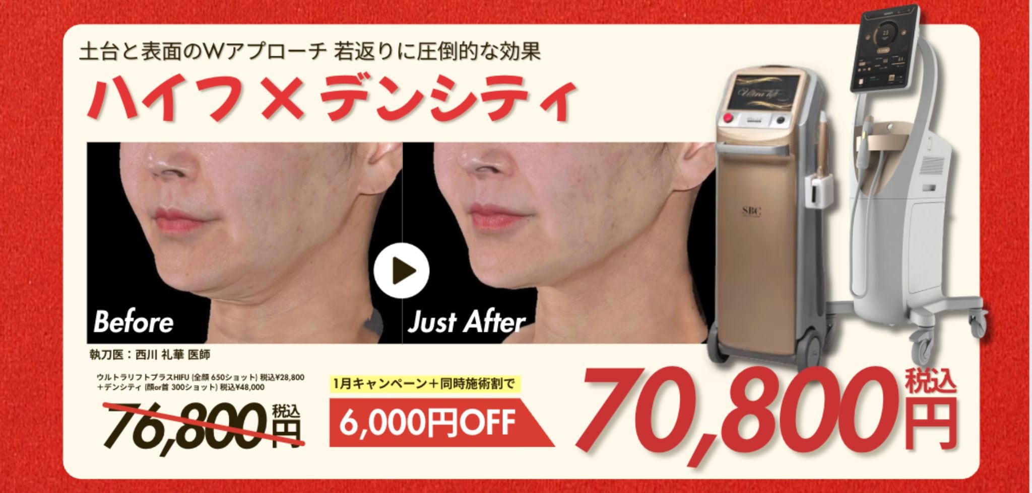 ◾️ウルトラリフトプラスHIFU(全顔 650ショット) 28,000円 + デンシティ(顔or首 300ショット) 48,000円