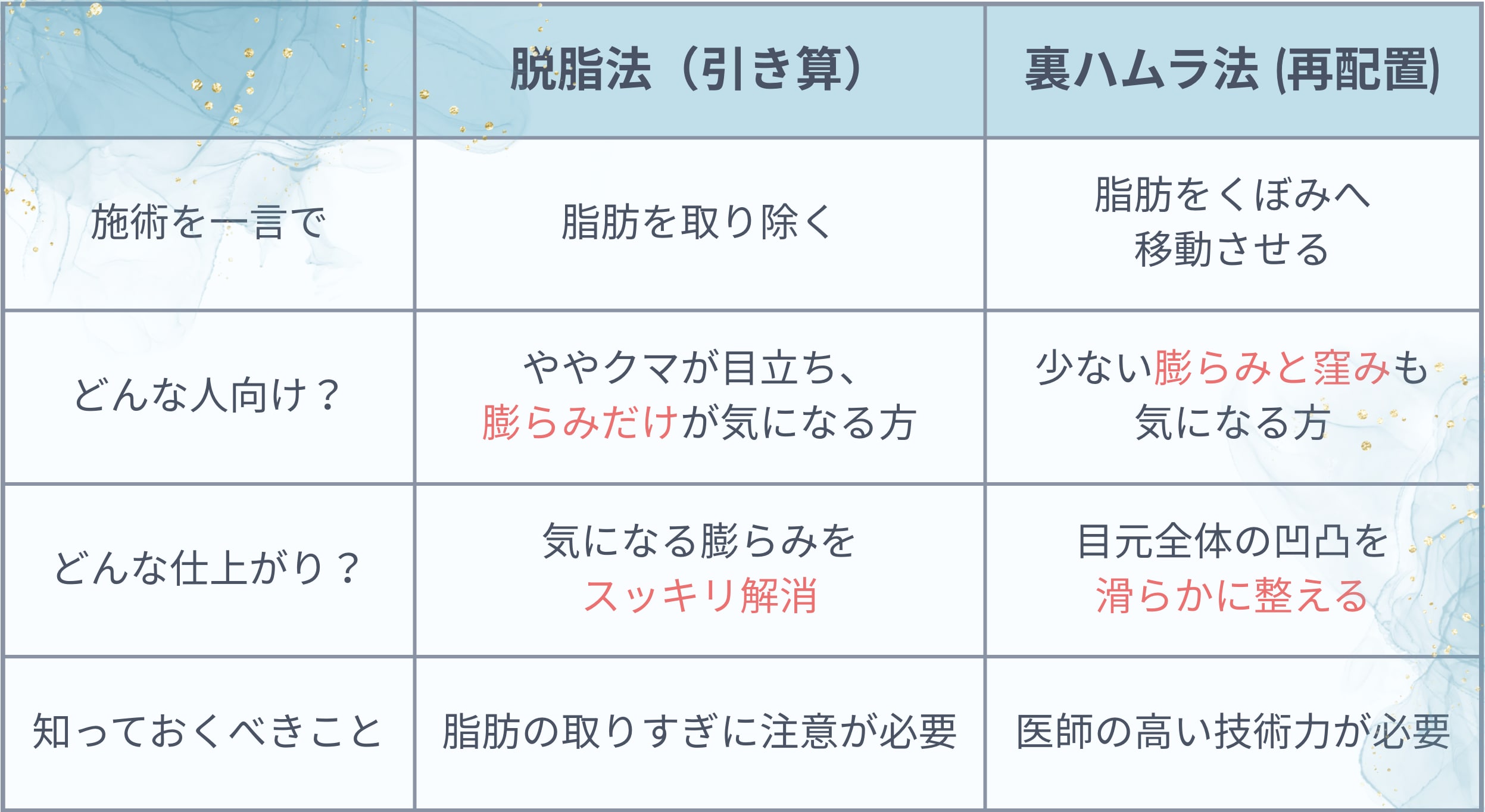 【失敗しないクマ取り】あなたに最適なのは?「脱脂法」と「裏ハムラ法」の違い