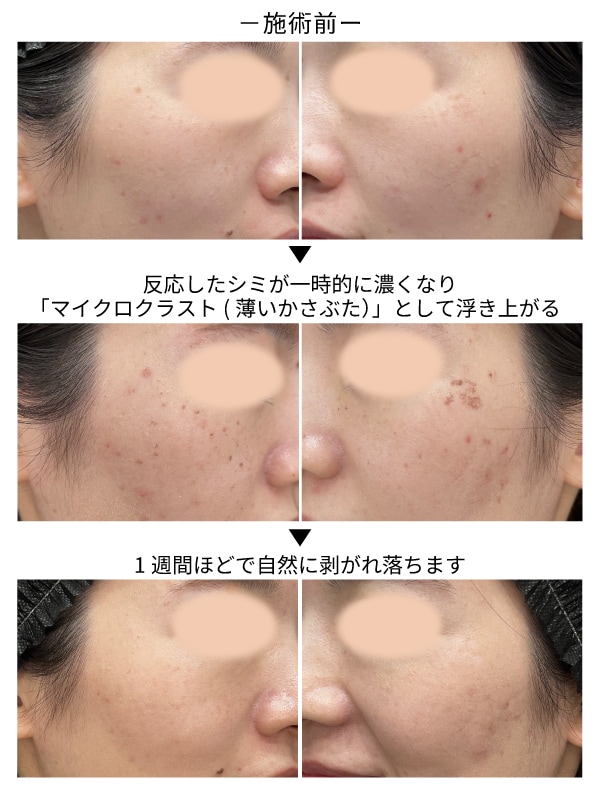 数日経つと、反応したシミが一時的に濃くなり「マイクロクラスト(薄いかさぶた)」として浮き上がってくることがありますが、これは順調に反応している証拠です。