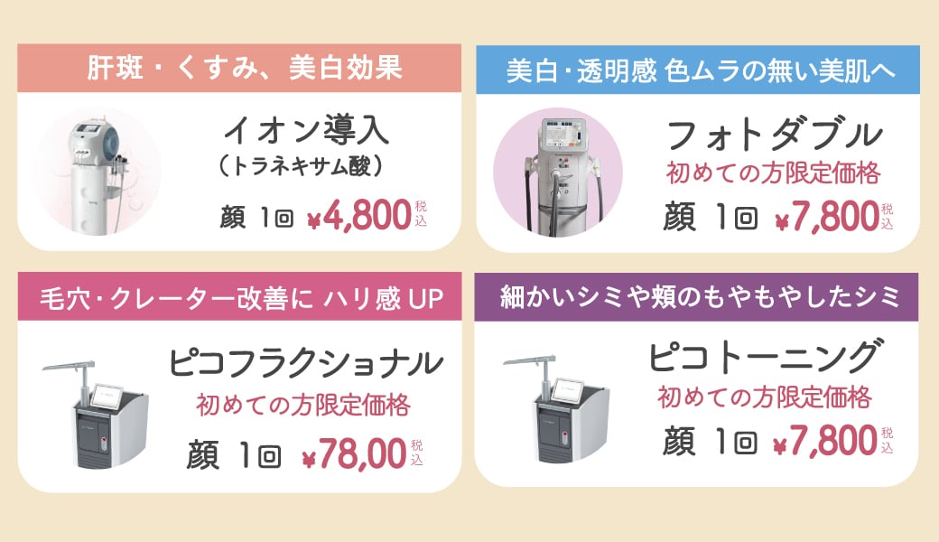 各施術が初めての方限定でお安くお試しができるレーザー治療が複数ありますので、ぜひポイントを使用してさらにお得にお試しください