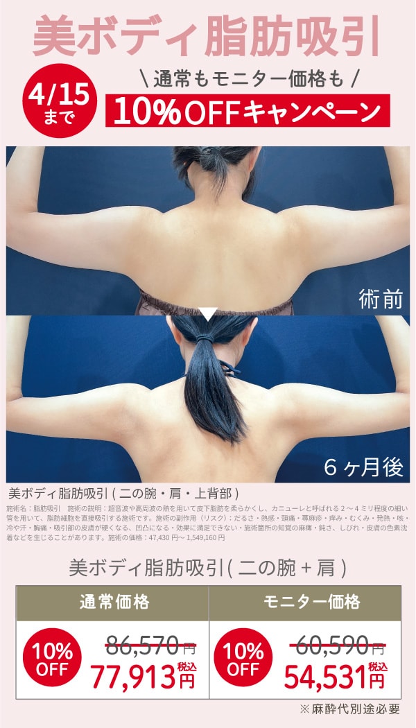 二の腕~肩、あご下~エラ下+頬、など広い範囲の脂肪吸引におすすめです。