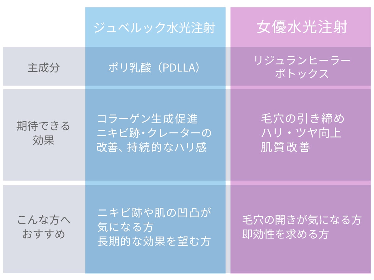 特に人気の「女優水光注射」と「ジュベルック水光注射」の効果の違いについて解説します。