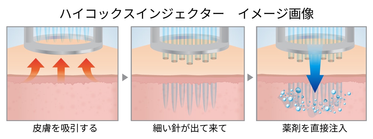 専用の注入機器「ハイコックスインジェクター」を使用し、ヒアルロン酸をはじめとする美容成分を均一かつ広範囲に届けることができます。