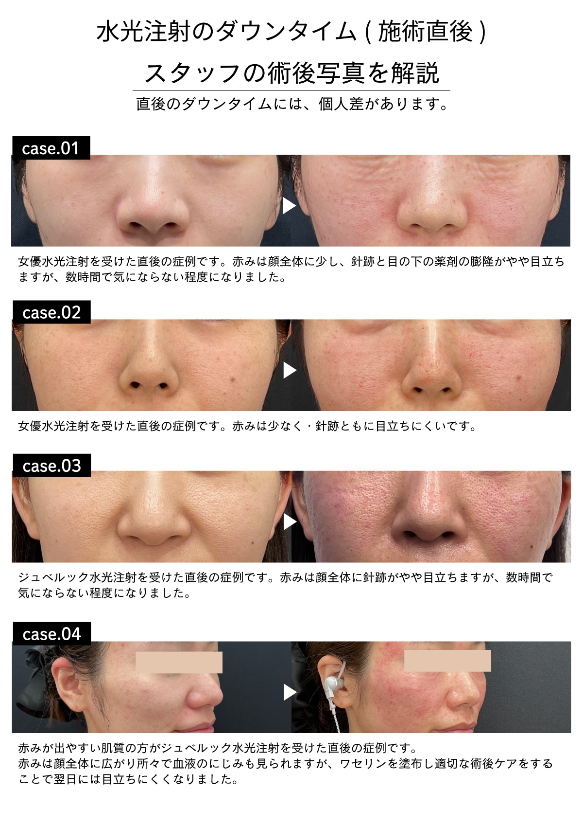 施術直後は、針穴による赤み、点状の内出血、ほてり感、肌の凹凸などが出ることがありますが、通常は数時間から長くても3~4日程度で治まります。