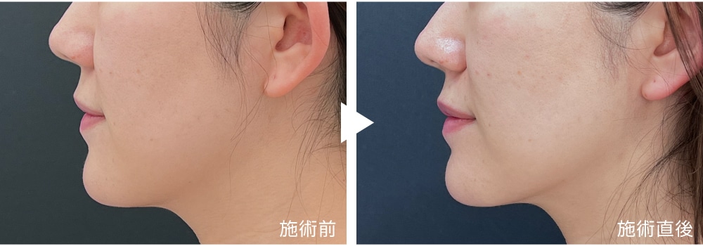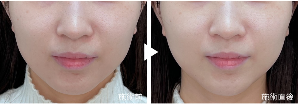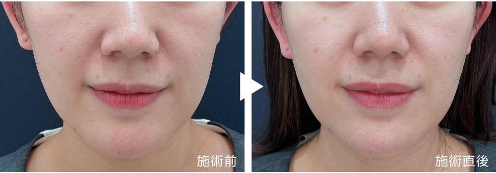 直後から目立った赤みや腫れは無く、口横のボリューム感の軽減、頬の位置が高くなっています。
