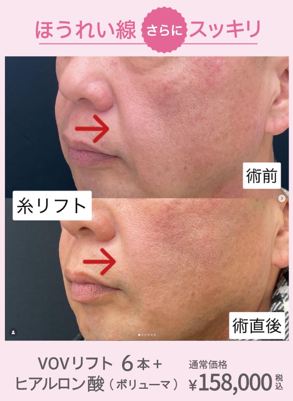 柔軟でしなやかな「VOVリフト」を6本使用し、気になるほうれい線の原因となる頬のたるみを優しく引き上げます。