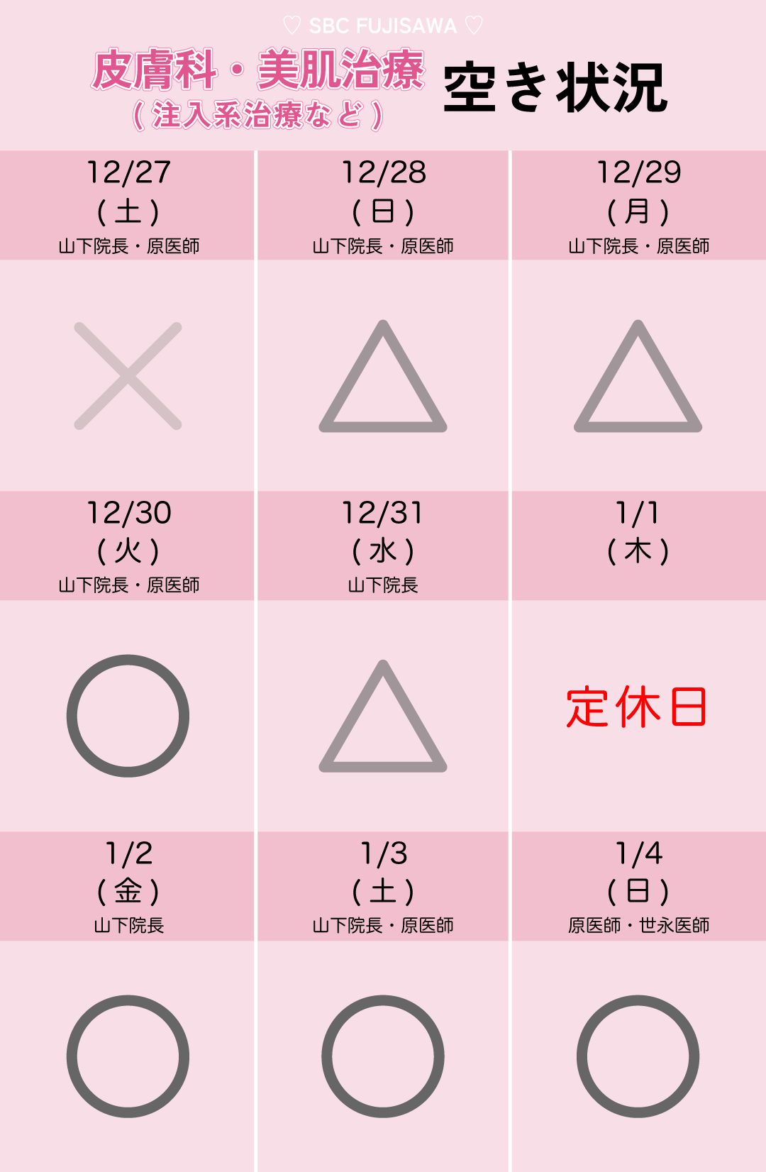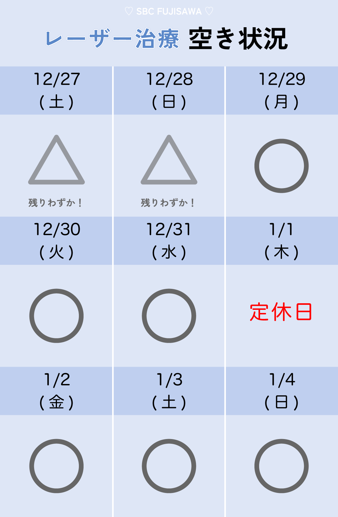 年末年始の営業日および皮膚科・レーザー治療の空き状況
