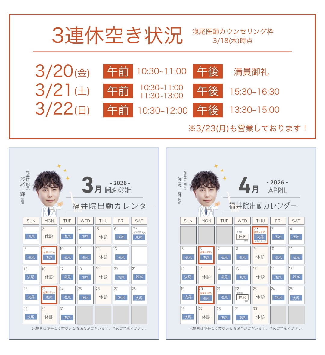診療時間 AM9:00~PM6:00(最終カウンセリング予約PM4:30まで)
