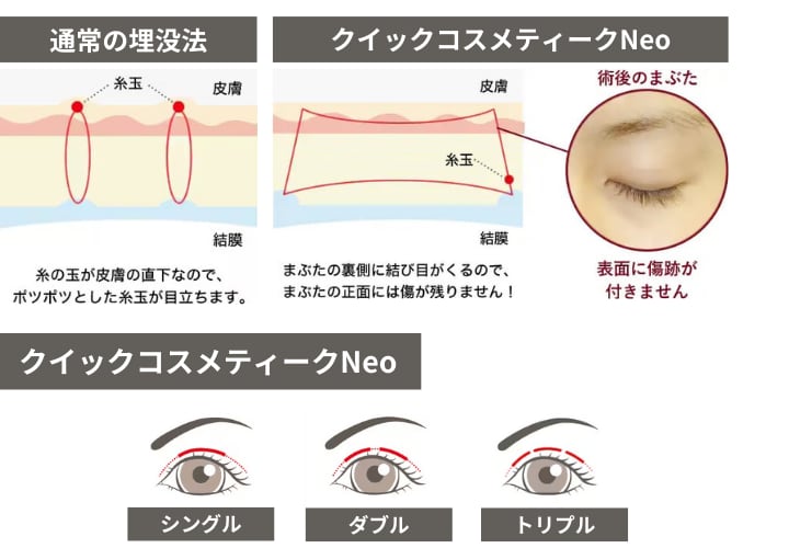 糸の結び目が表面に出ないので、目を閉じたときも自然でバレにくく、術後すぐにメイクが可能です!