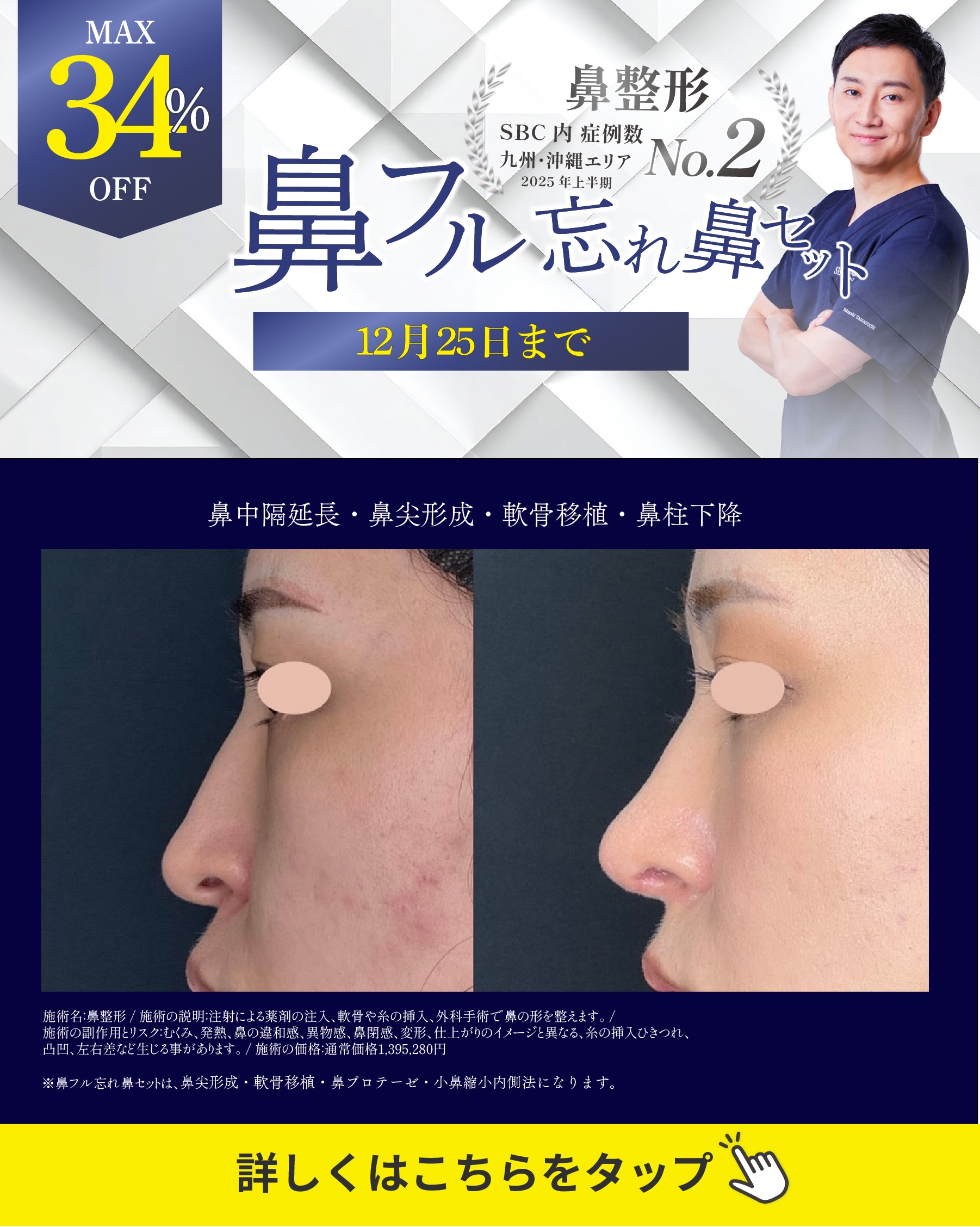 ※ 鼻フル忘れ鼻セットは、鼻尖部軟骨移植・鼻尖形成3D法・SBCプレミアムソフトプロテーゼ・小鼻縮小です。