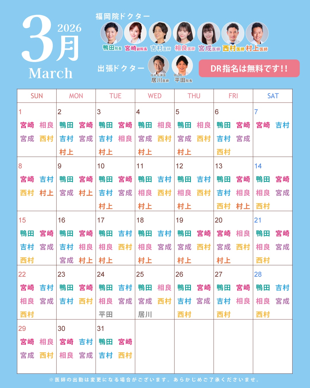 ※ドクターの出勤日は予告なく変更になる場合がございます。予めご了承ください。