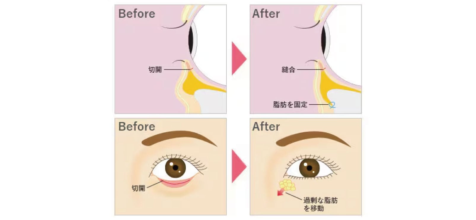 膨らんでいる部分からくぼんでいる部分に眼窩脂肪を移動させることで、膨らみと溝を同時に改善し、フラットな状態にすることができるため、眼窩脂肪を切り離すことなくクマを改善することができます。
