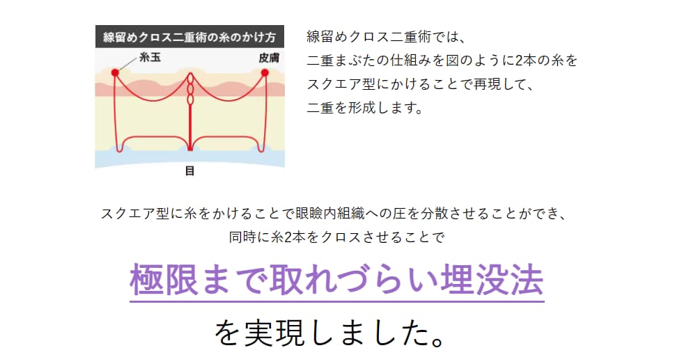 二重まぶたの仕組みを2本の糸をスクエア型にかけることで再現し、一重に戻りにくくなるよう開発された埋没法です。