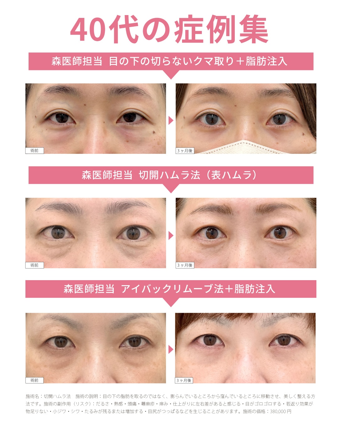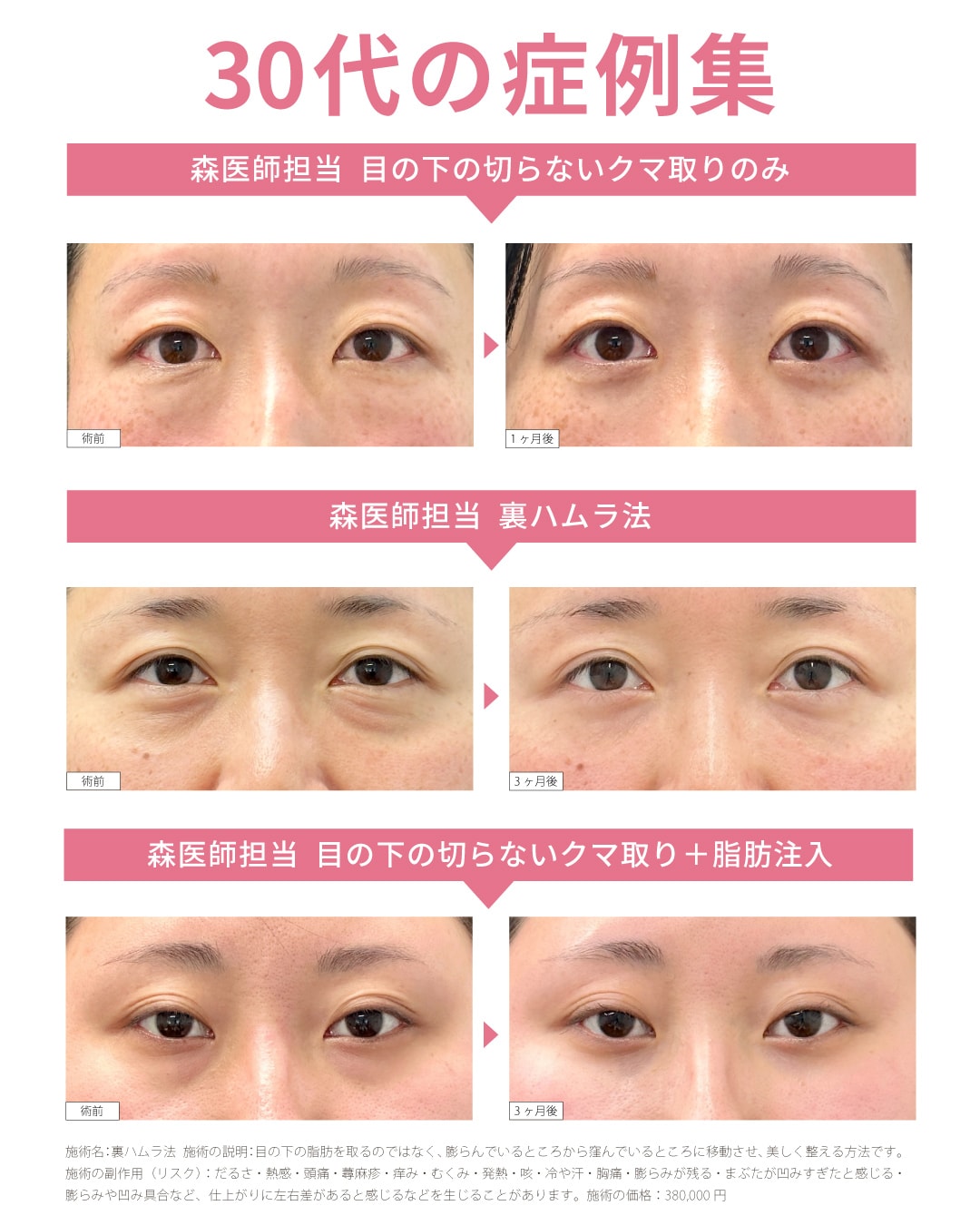 どちらもそれぞれメリット・デメリットがございますが、森医師はそのどちらも執刀可能ですので、目の下の切らないクマ取りしか取り扱っていないクリニックよりも幅広い提案をすることが可能です✨