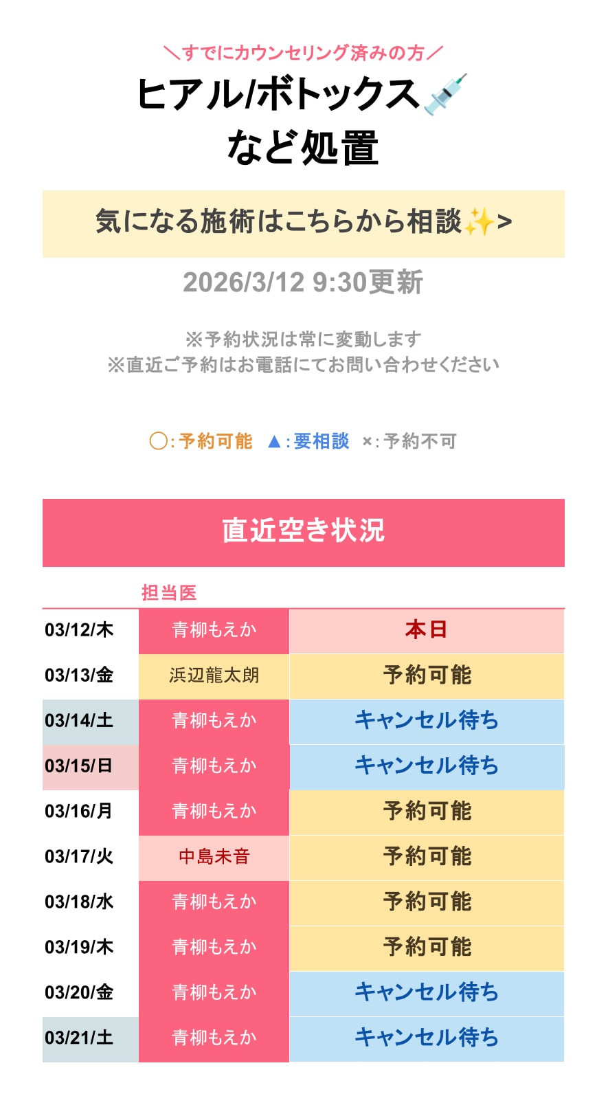 ✅Dr.処置空き状況 ※2026/3/12 9:30更新 [次回3/12 9時以降]