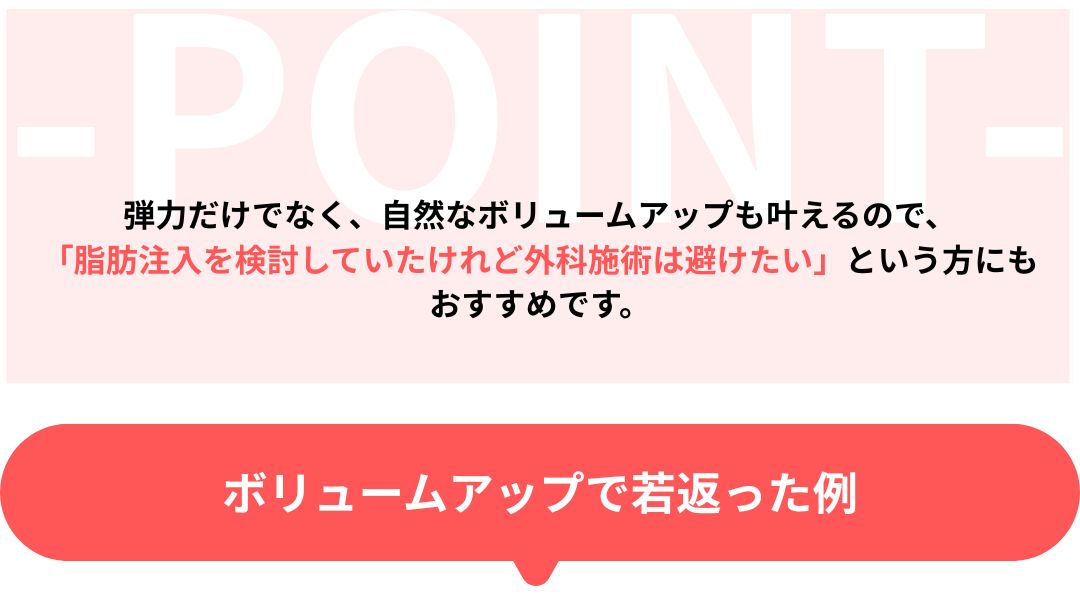一方プロファイロストラクチュラは、脂肪層にボリュームを持たせることができたるみの改善や、頬コケなどボリュームが不足した部分を補う効果があります。
