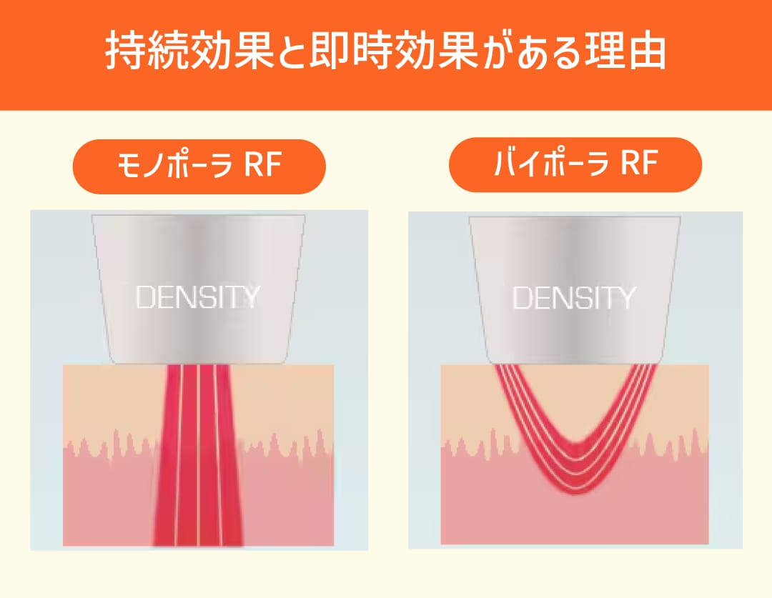従来の機械にはない、バイポーラとモノポーラの同時照射によって、皮膚と皮下を引き締める持続効果だけではなくたるみや小じわの改善などの即時効果も実現が可能です。
