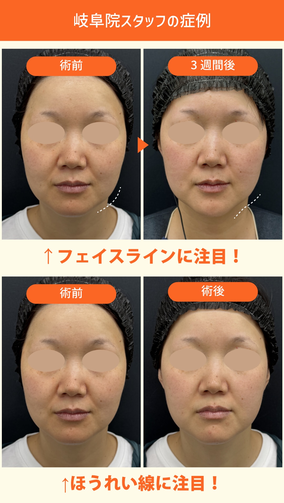 直後からほうれい線が薄くなり、3週間後にはフェイスラインがスッキリして見えます✨
