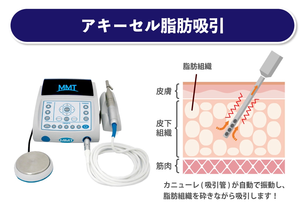 アキーセル脂肪吸引は様々な吸引管がある為、体の負担なく綺麗に吸引することが可能です。
