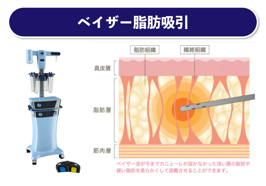 ベイザー派で脂肪を溶かしながら、かつアキーセルの機械で脂肪を砕きながら吸引するので