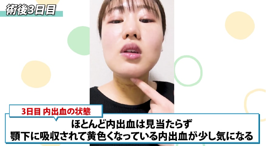 ほとんど内出血は見当たりませんが、顎下に吸収されて黄色くなっている内出血が少し気になります。