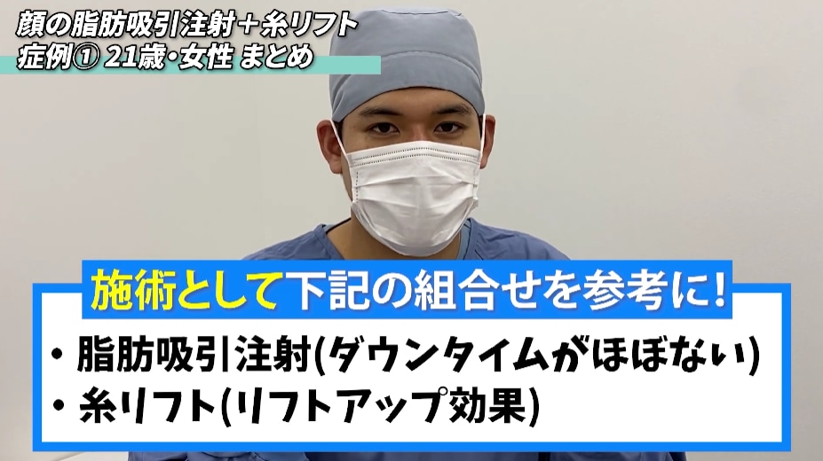 顔の脂肪吸引注射+糸リフトの症例を2つ紹介し、顎下スッキリを目指します。