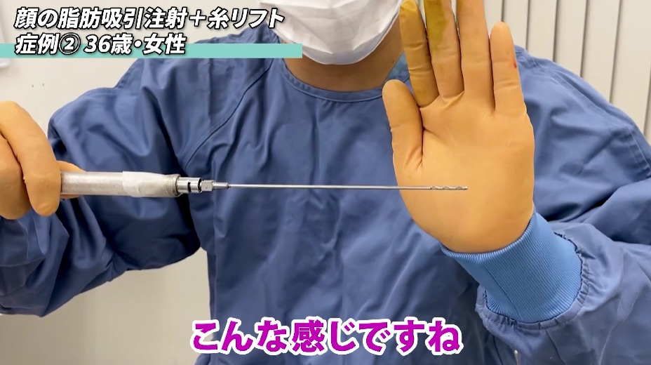 この細い注射針にシリンジを付けて、脂肪を吸引します。