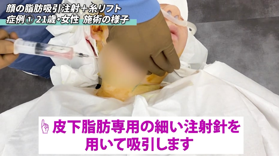 皮下脂肪専用の細い注射針を用いて吸引します。