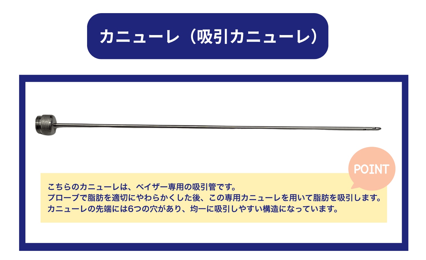プローブで脂肪を適切にやわらかくした後、このカニューレを用いて吸引します。