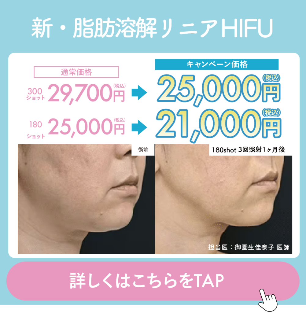 「新・脂肪溶解リニアHIFU」は、HIFU(高密度焦点式超音波)という特殊な超音波テクノロジーを利用したウルトラセルQ+/ウルトラフォーマーMPTにHIFU(ハイフ)を照射する施術です。線状に照射することで、広範囲に熱が伝わり、脂肪層にしっかりと熱を加え、脂肪細胞を溶解することができます。