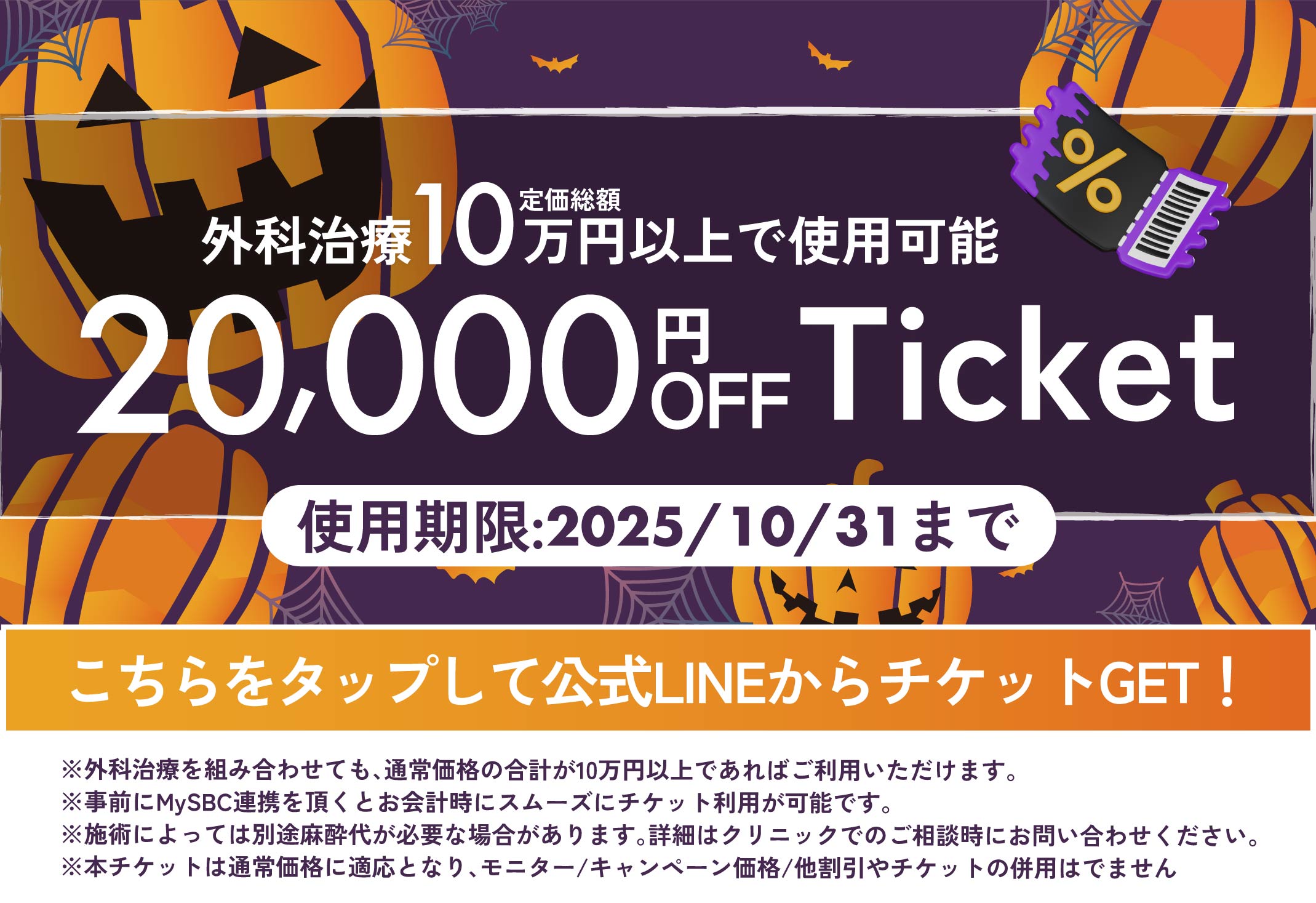 2このチケットはお会計時の麻酔代を除く美容外科治療の会計が10万円を超えた場合に2万円割引が適用されます。