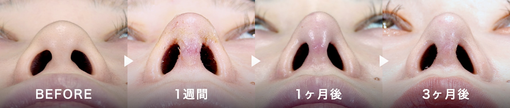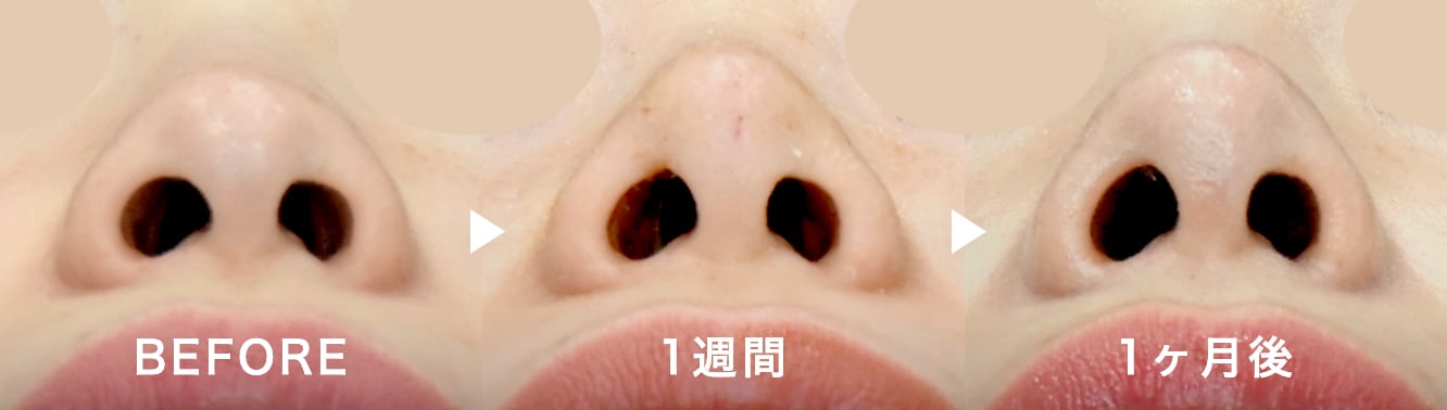 オープン法では、鼻腔内の切開に加え、この鼻孔内の切開箇所をつなぐように鼻柱中央を切開します。鼻腔内の傷はクローズ法と同様に外からは見えませんが、鼻柱中央の傷跡は目立たなくなるまでに2週間-1ヶ月ほどかかります。鼻柱は鼻の下から覗き込まなければ見えにくいため、想像より気にならないと感じる方も多いです。
